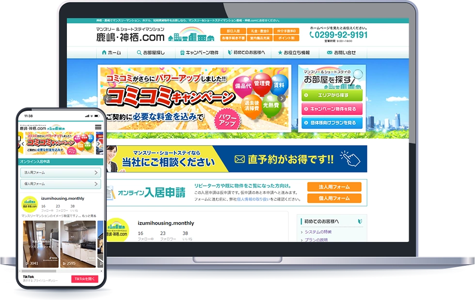 「マンスリー&ショートステイマンション鹿嶋・神栖.com」は、茨城県神栖市に1989年設立の不動産会社「株式会社 泉ハウジング」のグループ会社である「株式会社 泉ハウジング エステートサービス」が運営するWEBサイトです。その名称の通り、鹿嶋市と神栖市を中心に、自社管理物件を含むマンスリーマンションなどの短期家具・家電付き賃貸物件をご紹介しております。